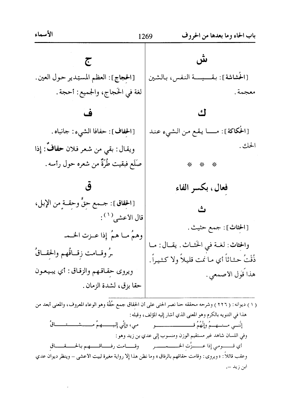 (1) ديوانه: (226) وشرحه محققه حنا نصر الحتى على أن الحِقاق جمع حُقَّة وهو الوعاء المعروف، والمعنى أبعد من هذا في التنويه بالكرم وهو المعنى الذي أشار إِليه المؤلف، وقبله: