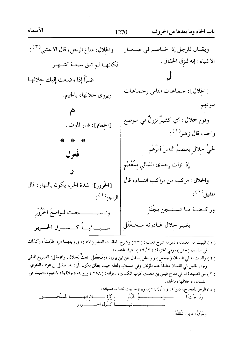 (2) والبيت له في اللسان (جعفل) و (حلل)، قال عن ابن بري: «ومُجَعْفَل: نعتٌّ لِحلال، والمجعفل: الصريع الملقى وجاء طفيل في اللسان مطلقاً عند المؤلف وفي اللسان، ولعله حينما يطلق يكون المراد به: طفيل بن عوف الغنوي.