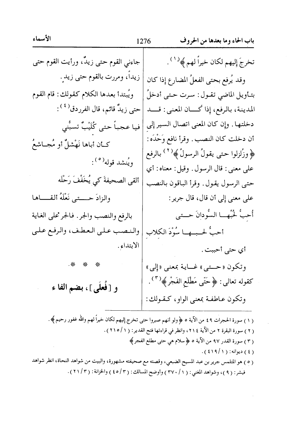 ويُبتدأ بعدها الكلام كقولك: قام القوم حتى زيدٌ قائم، قال الفرزدق «4»: