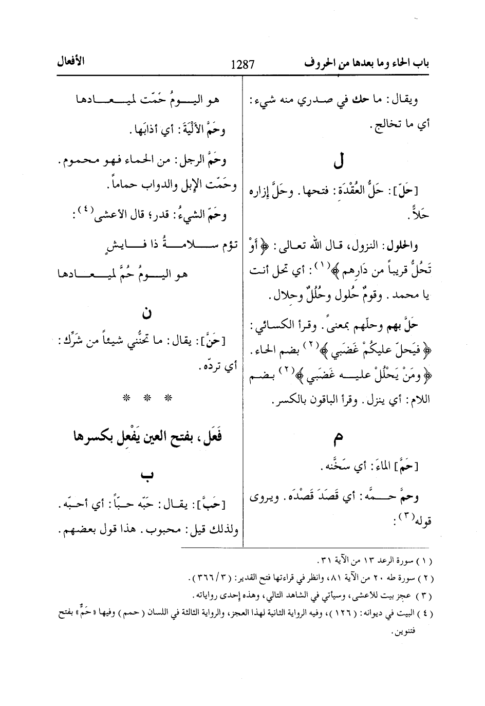وَمَنْ يَحْلُلْ عَلَيْهِ غَضَبِي «2» بضم اللام: أي ينزل. وقرأ الباقون بالكسر.