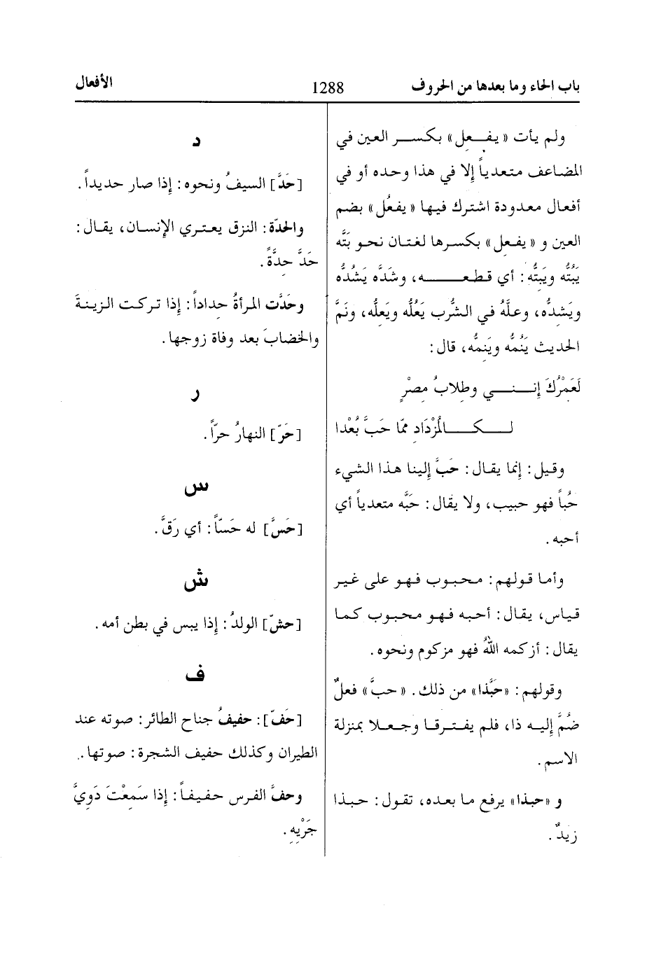 ولم يأت «يفعِل» بكسر العين في المضاعف متعدياً إِلا في هذا وحده أو في أفعال معدودة اشترك فيها «يفعُل» بضم العين و «يفعِل» بكسرها لغتان نحو بَتَّه يَبُتُّه ويَبِتُّه: أي قطعه، وشَدَّه يَشُدُّه ويَشِدُّه، وعلَّهُ في الشُّرب يَعُلُّه ويَعِلُّه، ونَمَّ الحديث يَنُمُّه ويَنِمُّه، قال:
