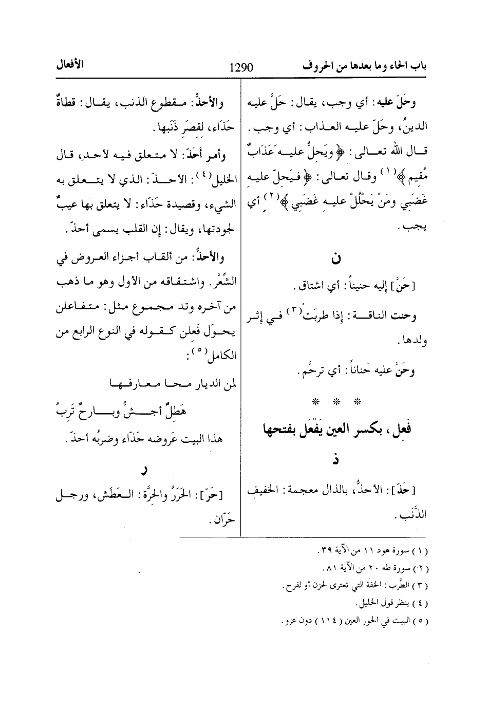 وأمر أَحَذّ: لا متعلق فيه لأحد، قال الخليل «4»: الأحذّ: الذي لا يتعلق به الشيء، وقصيدة حَذّاء: لا يتعلق بها عيبٌ لجودتها، ويقال: إِن القلب يسمى أحذّ.