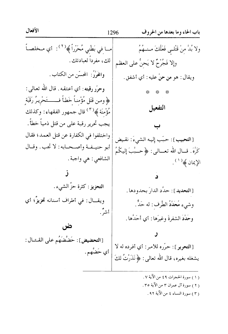 [التحرير]: حرّره للأمر: أي أفرده له لا يشغله بغيره، قال الله تعالى: نَذَرْتُ لَكَ ماا فِي بَطْنِي مُحَرَّراً «2»: أي مخلصاً لك، مفرداً لعبادتك.