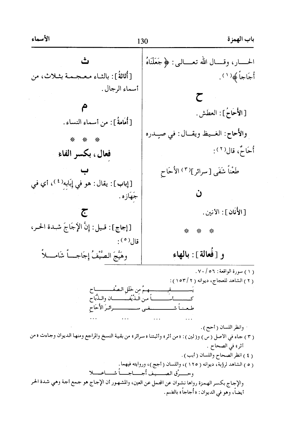 والإِجاج بكسر الهمزة رواها نشوان عن المجمل عن العين، والمشهور أن الإِجاج هو جمع أجة وهي شدة الحر أيضاً، وهو في الديوان: «أُجاجاً» بالضم.