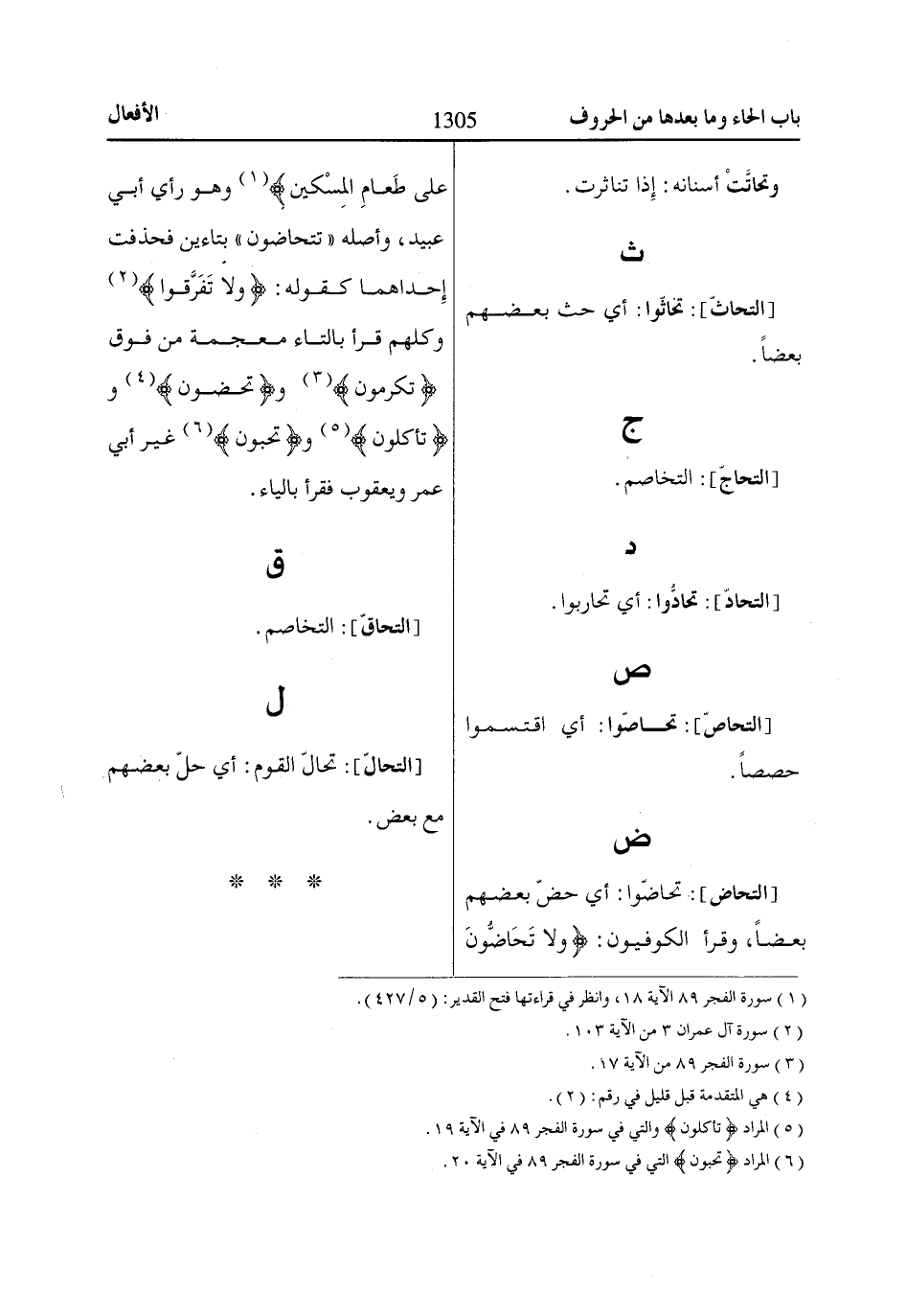 [التحاض]: تحاضّوا: أي حضّ بعضهم بعضاً، وقرأ الكوفيون: وَلاا تَحَاضُّونَ عَلى طَعاامِ الْمِسْكِينِ «1» وهو رأي أبي عبيد، وأصله «تتحاضون» بتاءين فحذفت إِحداهما كقوله: وَلاا تَفَرَّقُوا «2» وكلهم قرأ بالتاء معجمة من فوق تُكْرِمُونَ «3» وتَحَاضُّونَ «4» وتَأْكُلُونَ «5» وتُحِبُّونَ «6» غير أبي عمر ويعقوب فقرأ بالياء.
