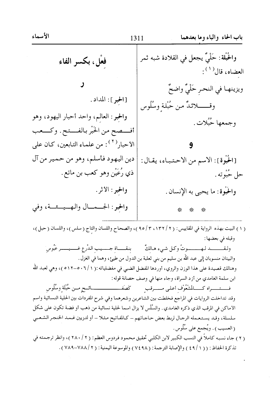 والحِبر: العالِم، واحد أحبار اليهود، وهو أفصح من الحَبْر بالفتح. وكعب الأحبار «2»: من علماء التابعين، كان على دين اليهود فأسلم، وهو من حمير من آل ذي رُعَيْن وهو كعب بن ماتع.