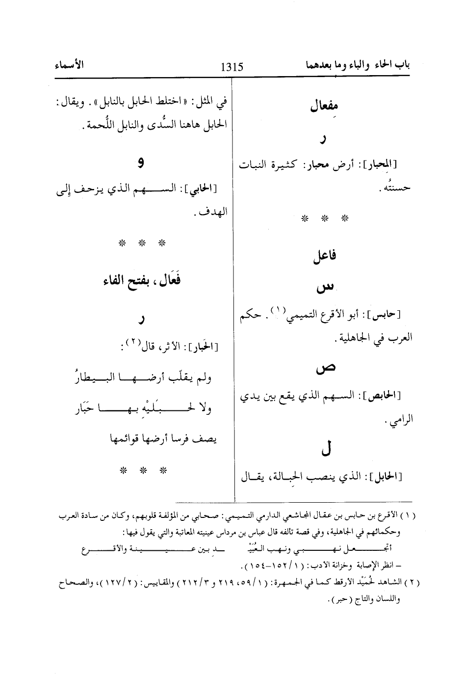 (2) الشاهد لحُمَيْد الأرقط كما في الجمهرة: (1/ 59، 219 و 3/ 212) والمقاييس: (2/ 127)، والصحاح واللسان والتاج (حبر).
