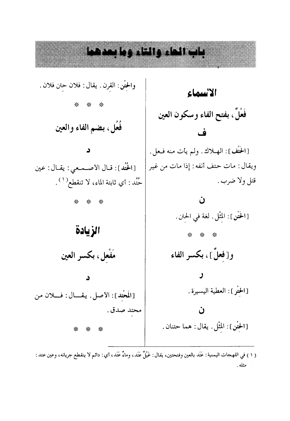 (1) في اللهجات اليمنية: عَتَد بالعين وفتحتين، يقال: غَيْلٌ عَتَد، وماءٌ عَتَد، أي: دائم لا ينقطع جريانه، وعين عتد: