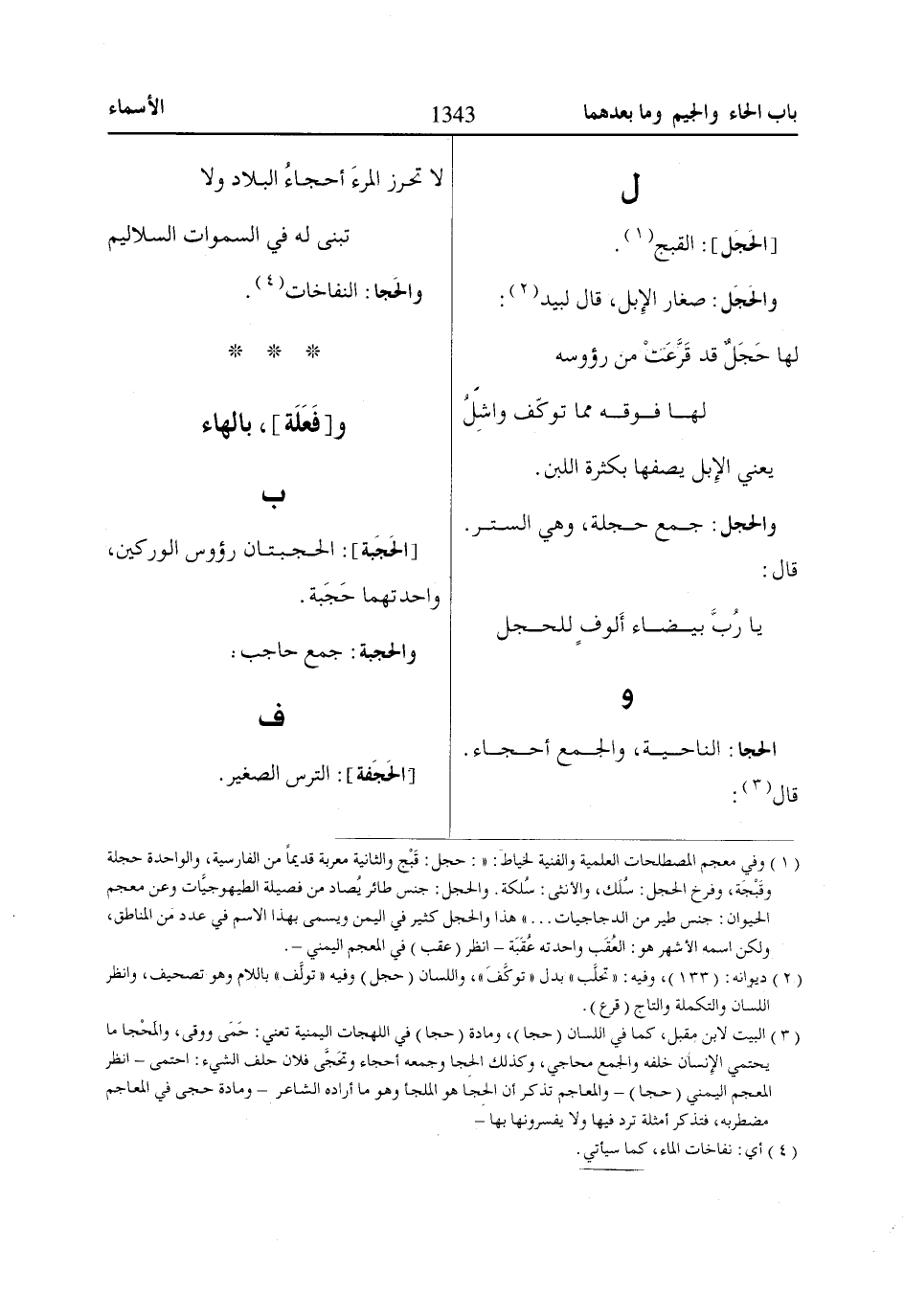 (1) وفي معجم المصطلحات العلمية والفنية لخياطَ: «: حجل: قَبْج والثانية معربة قديماً من الفارسية، والواحدة حجلة وقَبْجَة، وفرخ الحجل: سُلَك، والأنثى: سُلكة. والحجل: جنس طائر يُصاد من فصيلة الطيهوجيَّات وعن معجم الحيوان: جنس طير من الدجاجيات ... » هذا والحجل كثير في اليمن ويسمى بهذا الاسم في عدد من المناطق، ولكن اسمه الأشهر هو: العُقَب واحدته عُقَبَة- انظر (عقب) في المعجم اليمني-.