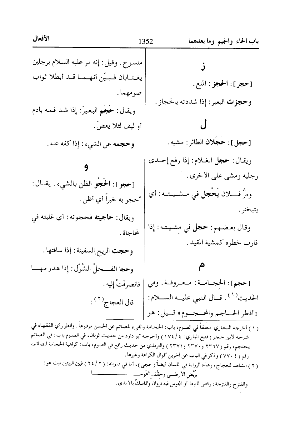 ويقال: حَجَمَ البعيرَ: إِذا شد فمه بأدم أو ليف لئلا يعضّ.