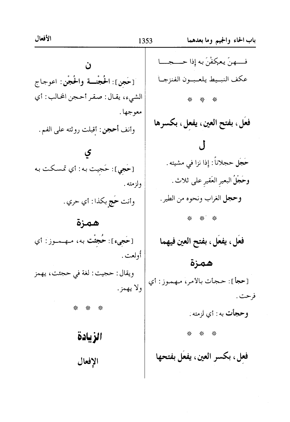 [حَجِن]: الحُجْنة والحُجْن: اعوجاج الشيء، يقال: صقر أحجن المخالب: أي معوجها.