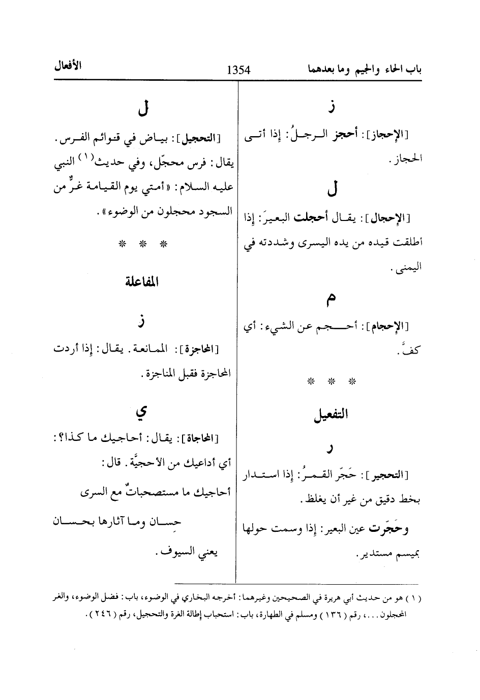 [الإِحجال]: يقال أحجلت البعيرَ: إِذا أطلقت قيده من يده اليسرى وشددته في اليمنى.