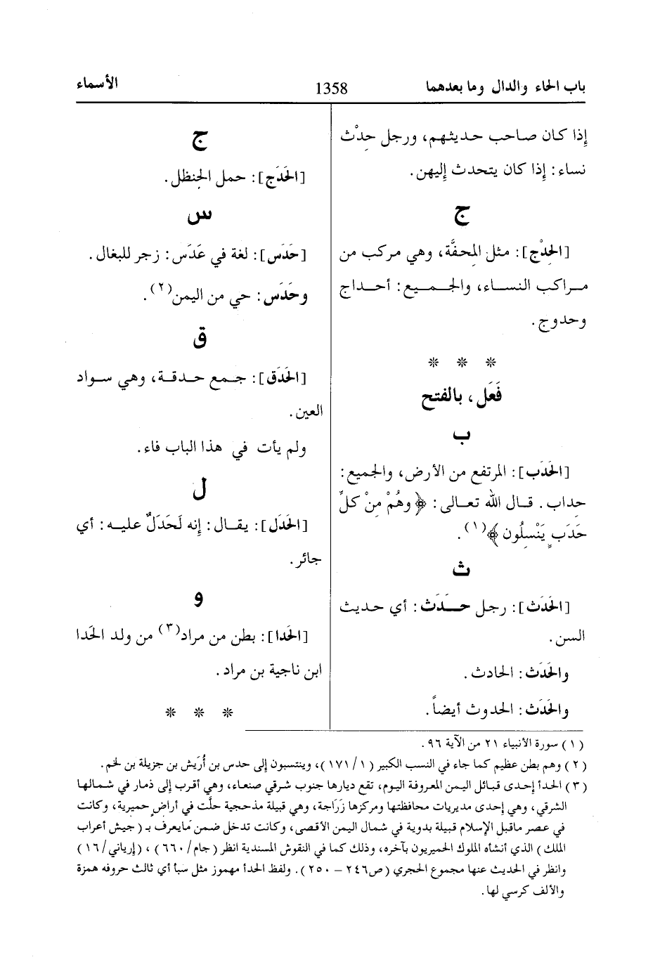 (3) الحدأ إِحدى قبائل اليمن المعروفة اليوم، تقع ديارها جنوب شرقي صنعاء، وهي أقرب إِلى ذمار في شمالها الشرقي، وهي إِحدى مديريات محافظتها ومركزها زَرَاجة، وهي قبيلة مذحجية حلَّت في أراضٍ حميرية، وكانت في عصر ما قبل الإِسلام قبيلة بدوية في شمال اليمن الأقصى، وكانت تدخل ضمن مَا يعرف ب (جيش أعراب الملك) الذي أنشأه الملوك الحميريون بآخره، وذلك كما في النقوش المسندية انظر (جام/ 660)، (إِرياني/ 16) وانظر في الحديث عنها مجموع الحجري (ص 246 - 250). ولفظ الحدأ مهموز مثل سبأ أي ثالث حروفه همزة والألف كرسي لها.