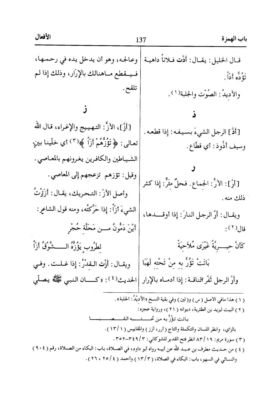 [أَزَّ]، الأَزُّ: التهييج والإِغراء، قال اللّاه تعالى: تَؤُزُّهُمْ أَزًّا «3» أي خلّينا بين الشياطين والكافرين يغرونهم بالمعاصي.