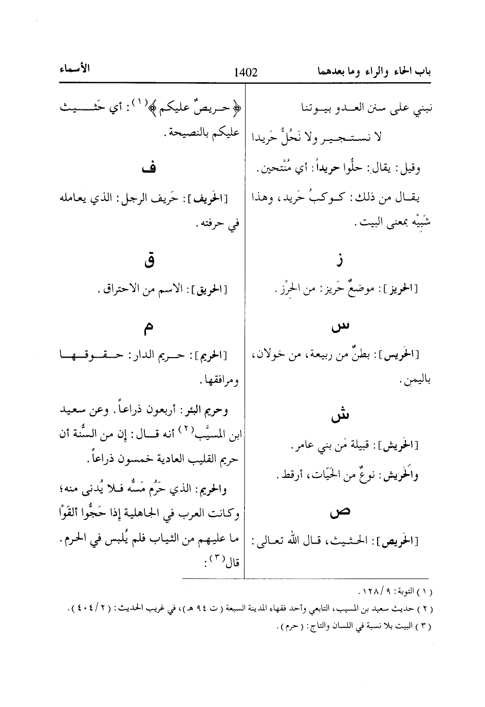 [الحَريص]: الحثيث، قال اللّاه تعالى: حَرِيصٌ عَلَيْكُمْ «1»: أي حَثيث عليكم بالنصيحة.
