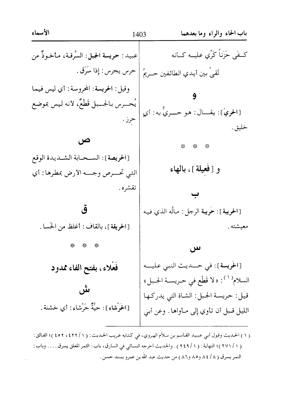 في حديث النبي عليه السلام «1»: «لا قَطْع في حريسة الجبل»