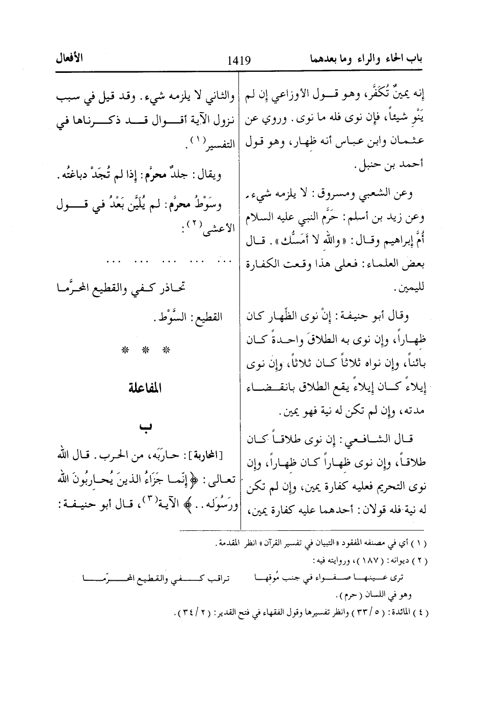 [المحاربة]: حارَبَه، من الحرب. قال اللّاه تعالى: إِنَّماا جَزااءُ الَّذِينَ يُحاارِبُونَ اللّاهَ وَرَسُولَهُ ... الآية «3»، قال أبو حنيفة: