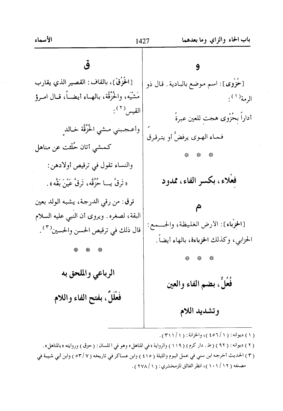 (2) ديوانه: (92) (ط. دار كرم) (119) والرواية «في المناهل» وهو في اللسان: (حزق) وروايته «بالمناهل».