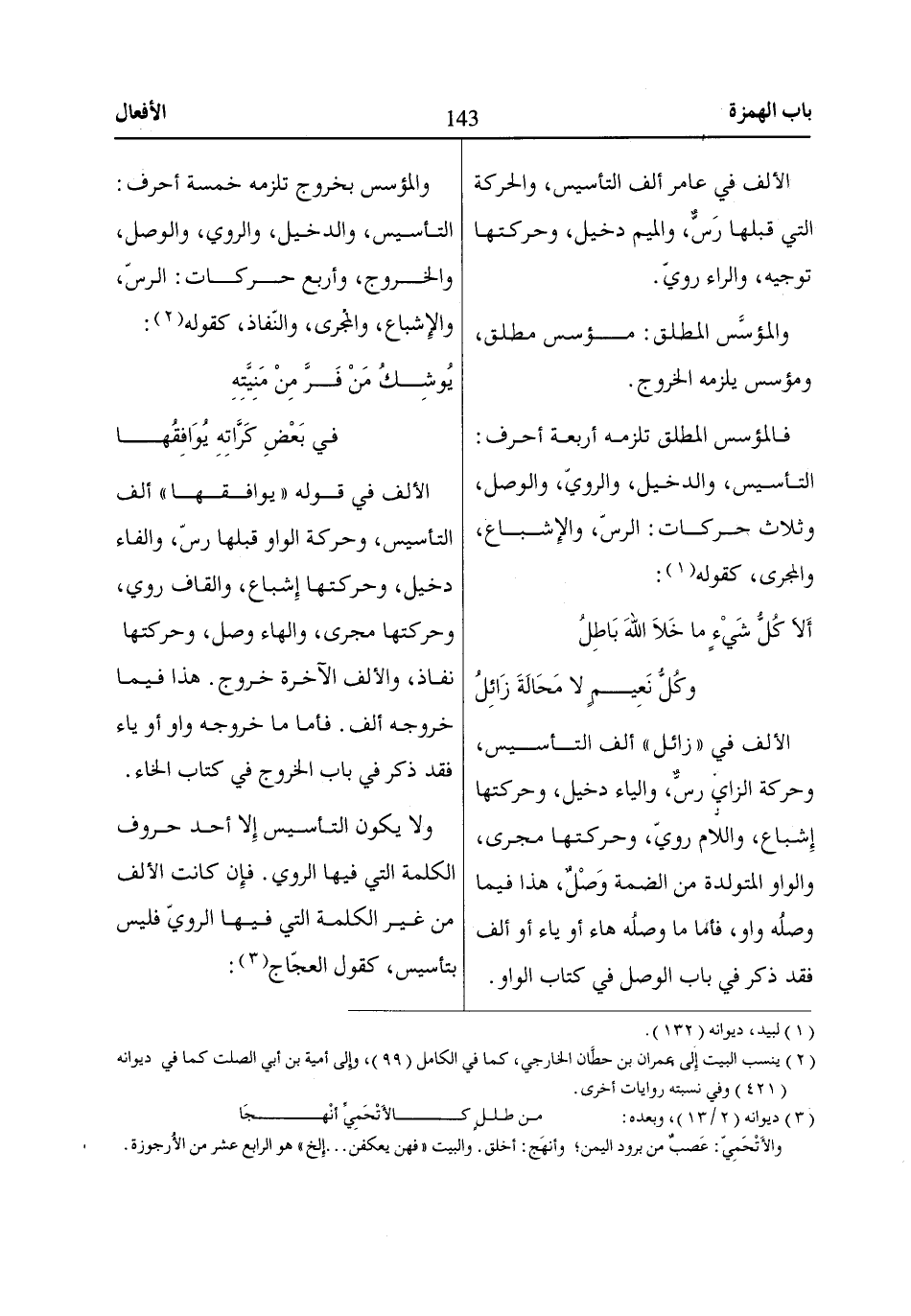 الألف في قوله «يوافقها» ألف التأسيس، وحركة الواو قبلها رسّ، والفاء دخيل، وحركتها إِشباع، والقاف روي، وحركتها مجرى، والهاء وصل، وحركتها نفاذ، والألف الآخرة خروج. هذا فيما خروجه ألف. فأما ما خروجه واو أو ياء فقد ذكر في باب الخروج في كتاب الخاء.