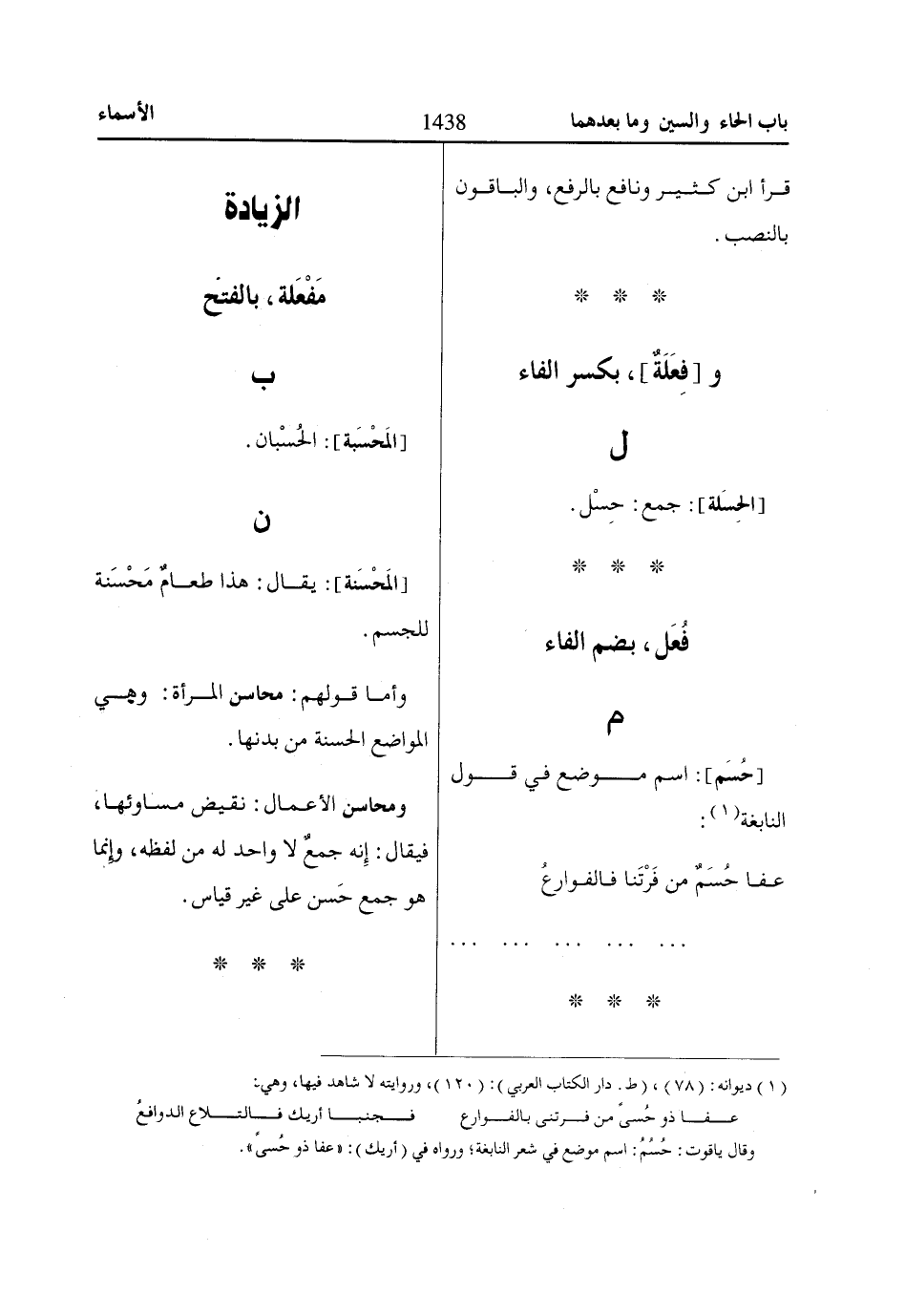 وقال ياقوت: حُسُمُ: اسم موضع في شعر النابغة؛ ورواه في (أريك): «عفا ذو حُسىً».