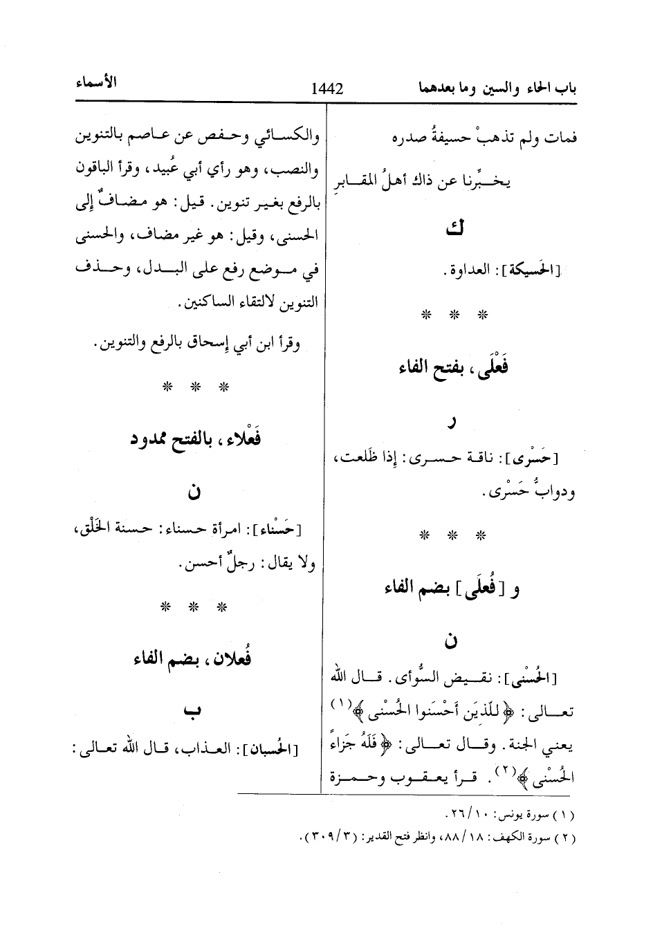 [حَسْناء]: امرأة حسناء: حسنة الخَلْق، ولا يقال: رجلٌ أحسن.