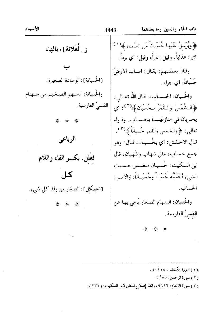 (3) سورة الأنعام: 6/ 96، وانظر إِصلاح المنطق لابن السكيت: (236).