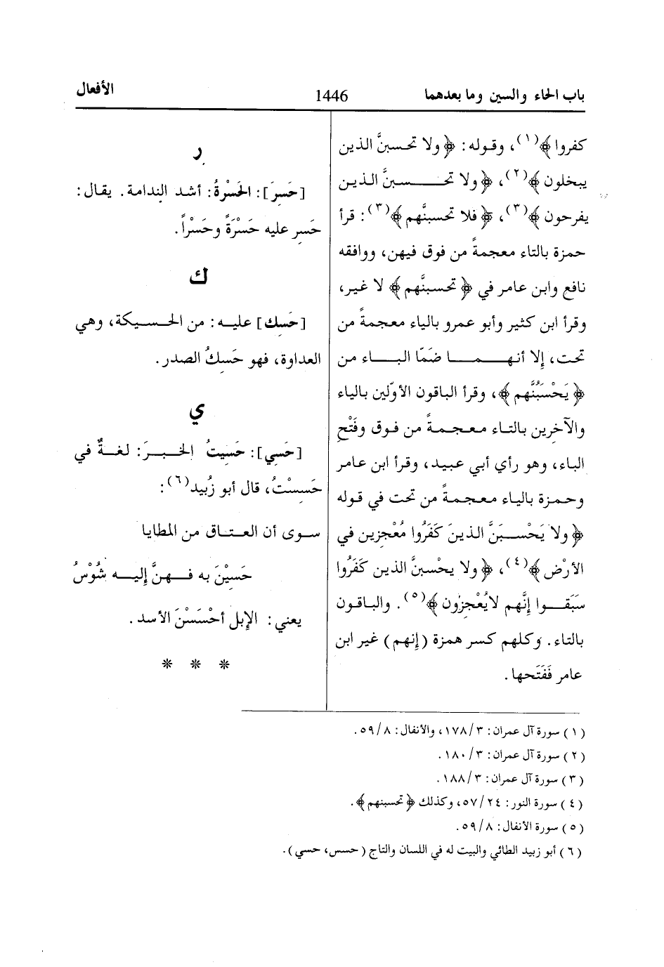 كَفَرُوا «1»، وقوله: ولا تحسبنّ الذين يبخلون «2»، ولاا تَحْسَبَنَّ الَّذِينَ يَفْرَحُونَ «3»، فَلاا تَحْسَبَنَّهُمْ «3»: قرأ حمزة بالتاء معجمةً من فوق فيهن، ووافقه نافع وابن عامر في تَحْسَبَنَّهُمْ لا غير، وقرأ ابن كثير وأبو عمرو بالياء معجمةً من تحت، إِلا أنهما ضَمّا الباء من يحسبنّهم، وقرأ الباقون الأوّلين بالياء والآخِرين بالتاء معجمةً من فوق وفَتْحِ الباء، وهو رأي أبي عبيد، وقرأ ابن عامر وحمزة بالياء معجمةً من تحت في قوله لا يحسبنّ الَّذِينَ كَفَرُوا مُعْجِزِينَ فِي الْأَرْضِ «4»، وَلاا يَحْسَبَنَّ الَّذِينَ كَفَرُوا سَبَقُوا إِنَّهُمْ لاا يُعْجِزُونَ «5». والباقون بالتاء. وكلهم كسر همزة (إِنهم) غير ابن عامر فَفَتَحها.