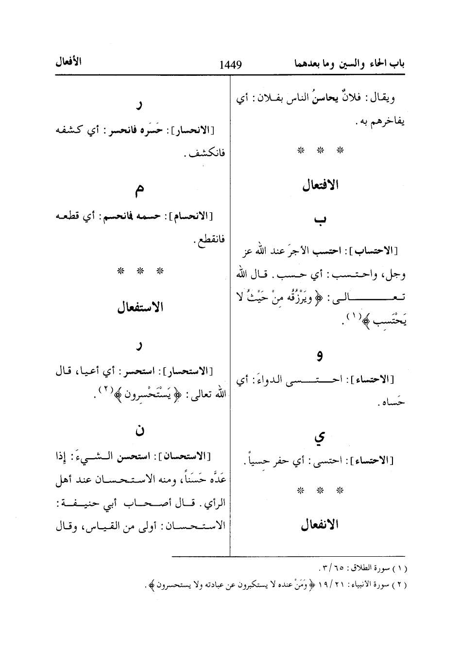 [الاستحسار]: استحسر: أي أعيا، قال الله تعالى: يَسْتَحْسِرُونَ «2».
