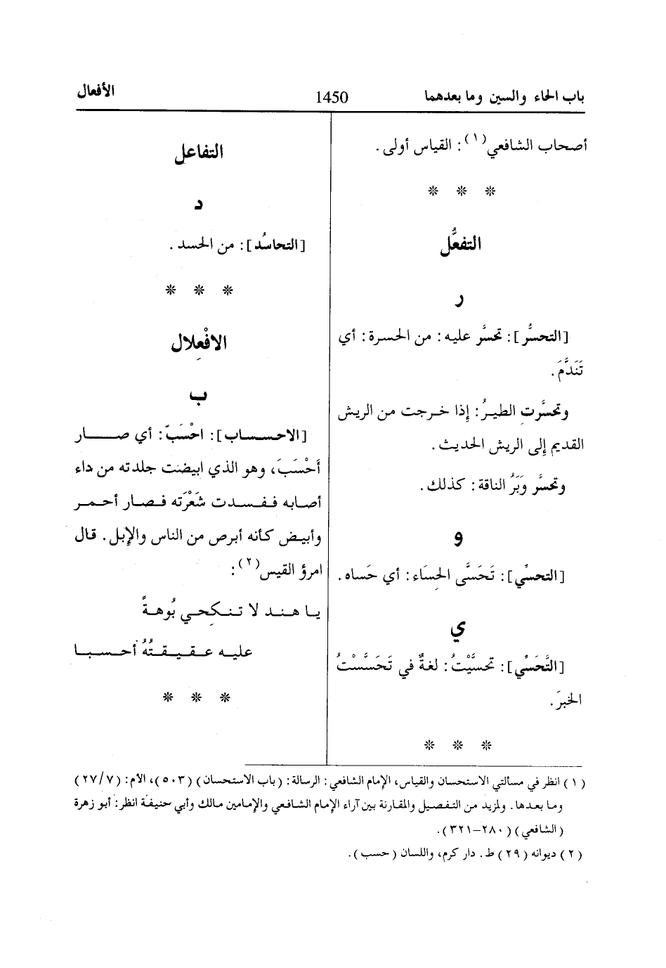 [الاحسباب]: احْسَبّ: أي صار أَحْسَبَ، وهو الذي ابيضت جلدته من داء أصابه ففسدت شَعْرَته فصار أحمر وأبيض كأنه أبرص من الناس والإِبل. قال امرؤ القيس «2»: