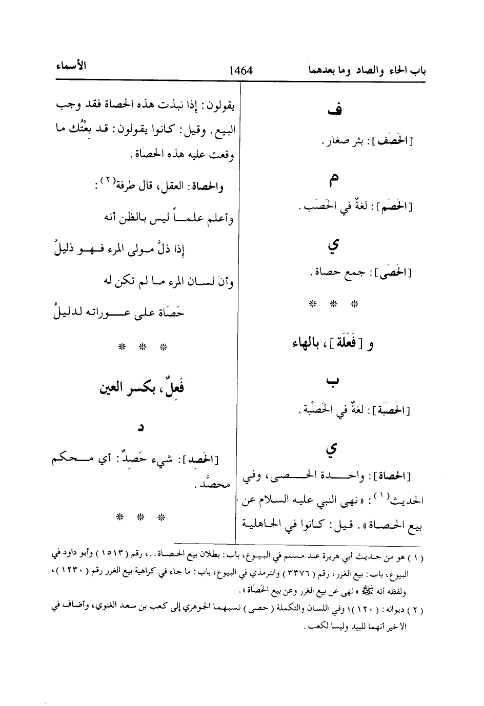 (1) هو من حديث أبي هريرة عند مسلم في البيوع، باب: بطلان بيع الحصاة .. ، رقم (1513) وأبو داود في البيوع، باب: بيع الغرر، رقم (3376) والترمذي في البيوع، باب: ما جاء في كراهية بيع الغرر رقم (1230)، ولفظه أنه صلّى الله عليه وسلم «نهى عن بيع الغرر وعن بيع الحَصَاة».
