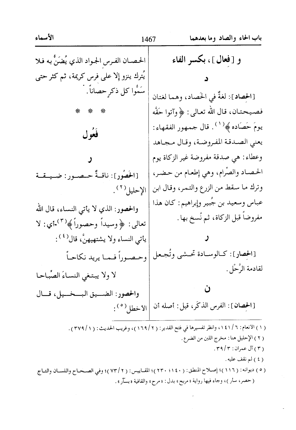 [الحِصاد]: لغةٌ في الحَصاد، وهما لغتان فصيحتان، قال الله تعالى: وَآتُوا حَقَّهُ يَوْمَ حَصاادِهِ «1». قال جمهور الفقهاء: