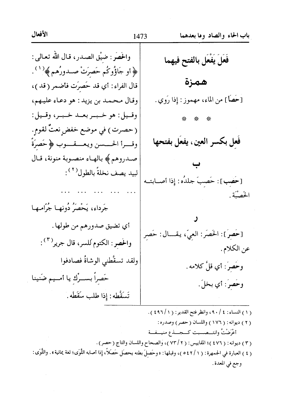 (3) ديوانه: (476)؛ المقاييس: (2/ 73)، والصحاح واللسان والتاج (حصر).