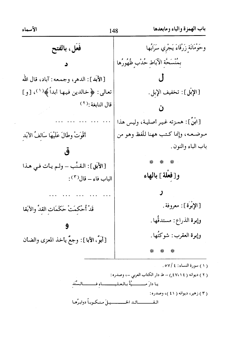 [الأَبَد]: الدهر، وجمعه: آباد، قال اللّاه تعالى: خاالِدِينَ فِيهاا أَبَداً* «1»، [و] قال النابغة: «2»