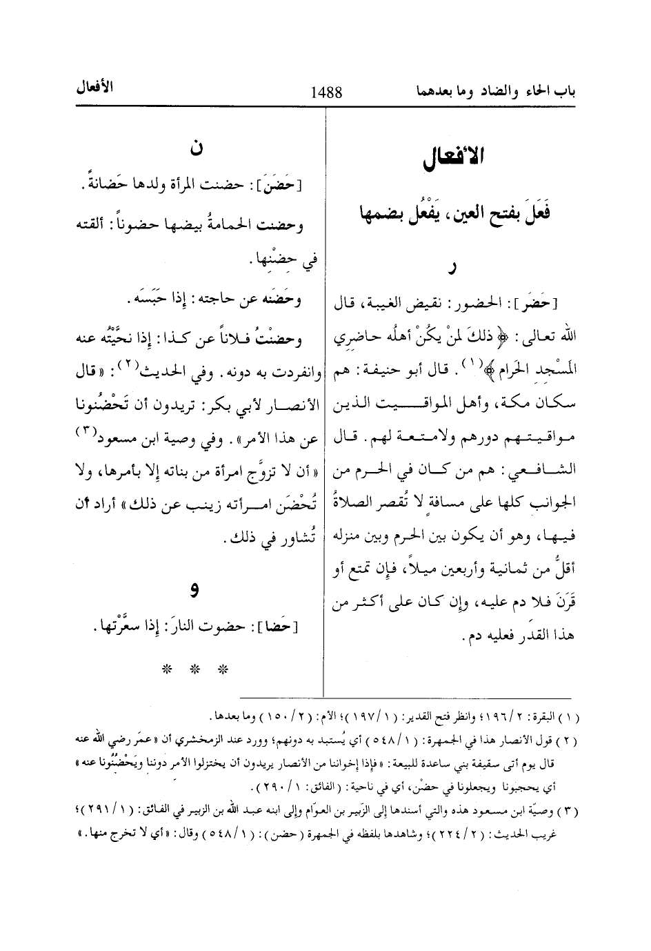 (3) وصيّة ابن مسعود هذه والتي أسندها إِلى الزّبير بن العوّام وإِلى ابنه عبد الله بن الزبير في الفائق: (1/ 291)؛ غريب الحديث: (2/ 224)؛ وشاهدها بلفظه في الجمهرة (حضن): (1/ 548) وقال: «أي لا تخرج منها. »