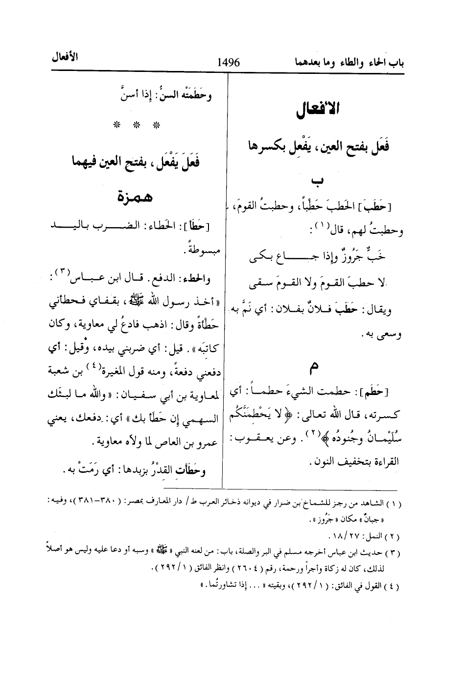 [حَطَم]: حطمت الشيءَ حطماً: أي كسرته، قال الله تعالى: لاا يَحْطِمَنَّكُمْ سُلَيْماانُ وَجُنُودُهُ «2». وعن يعقوب: