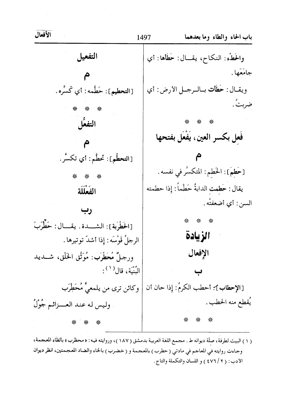 (1) البيت لطرفة، صِلَة ديوانه ط. مجمع اللغة العربية بدمشق (187)، وروايته فيه: «محظرب» بالظاء المعجمة، وجاءت روايته في المعاجم في مادتي (حظرب) بالمعجمة و (خضرب) بالخاء والضاد المعجمتين، انظر ديوان الأدب: (2/ 476) واللسان والتكملة والتاج.