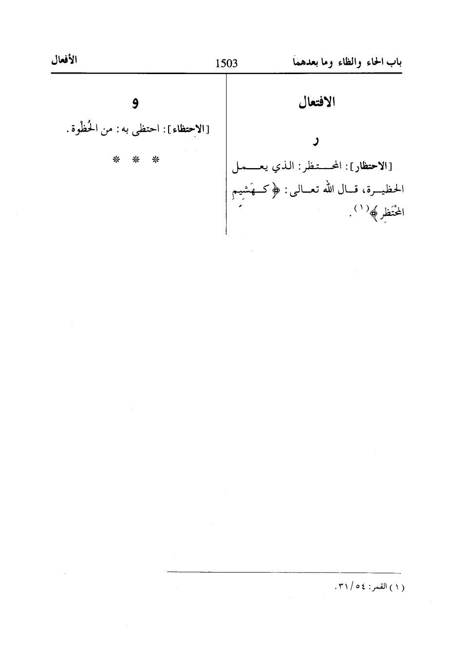[الاحتظار]: المحتظر: الذي يعمل الحظيرة، قال الله تعالى: كَهَشِيمِ الْمُحْتَظِرِ «1».