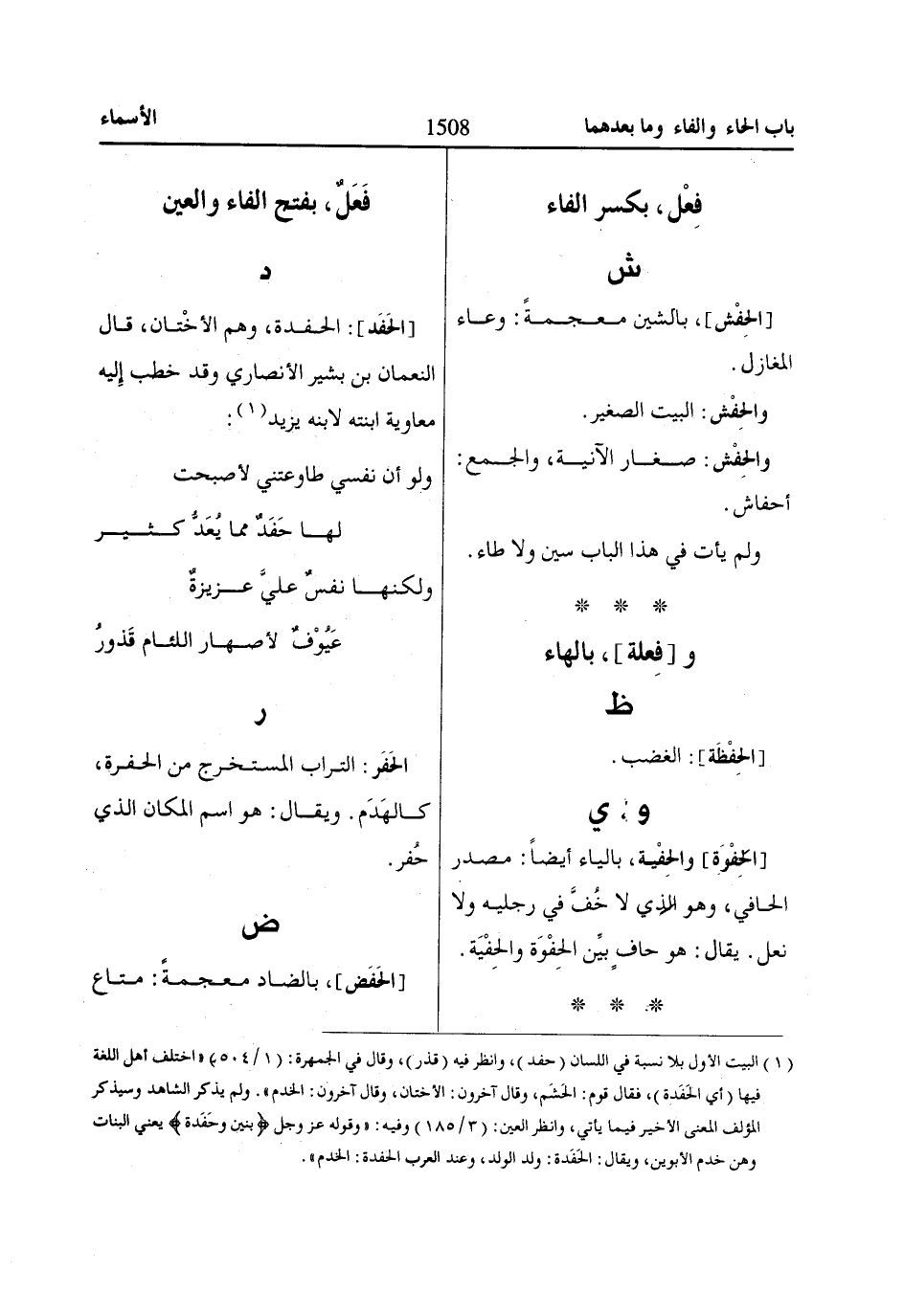 (1) البيت الأول بلا نسبة في اللسان (حفد)، وانظر فيه (قذر)، وقال في الجمهرة: (1/ 504) «اختلف أهل اللغة فيها (أي الحَفَدة)، فقال قوم: الحَشَم، وقال آخرون: الأختان، وقال آخرون: الخدم». ولم يذكر الشاهد وسيذكر المؤلف المعنى الأخير فيما يأتي، وانظر العين: (3/ 185) وفيه: «وقوله عز وجل بَنِينَ وَحَفَدَةً يعني البنات وهن خدم الأبوين، ويقال: الحَفَدة: ولد الولد، وعند العرب الحفدة: الخدم».