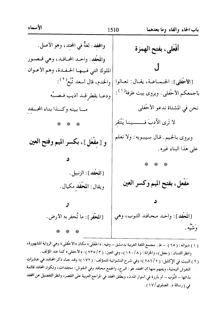 [الأحْفَلى]: الجماعة، يقال: تعالوا بأجمعكم الأَحْفلى. ويروى بيت طرفة «1»: