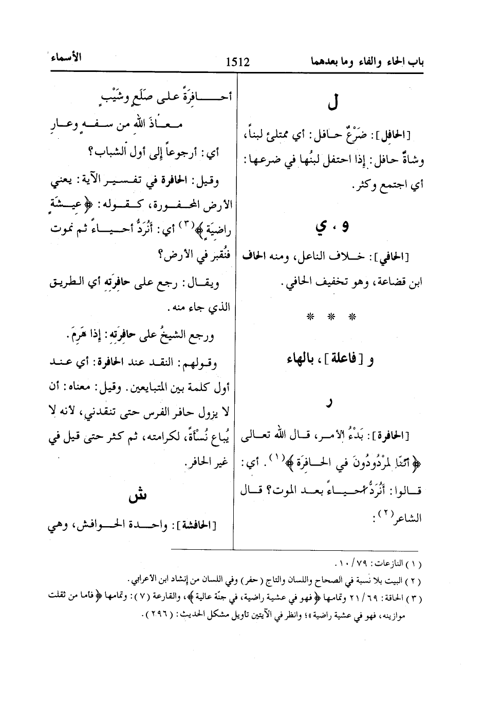 [الحافي]: خلاف الناعل، ومنه الحاف ابن قضاعة، وهو تخفيف الحافي.