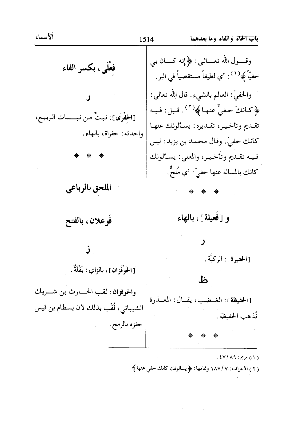 (2) الأعراف: 7/ 187 وتمامها: يَسْئَلُونَكَ كَأَنَّكَ حَفِيٌّ عَنْهاا.