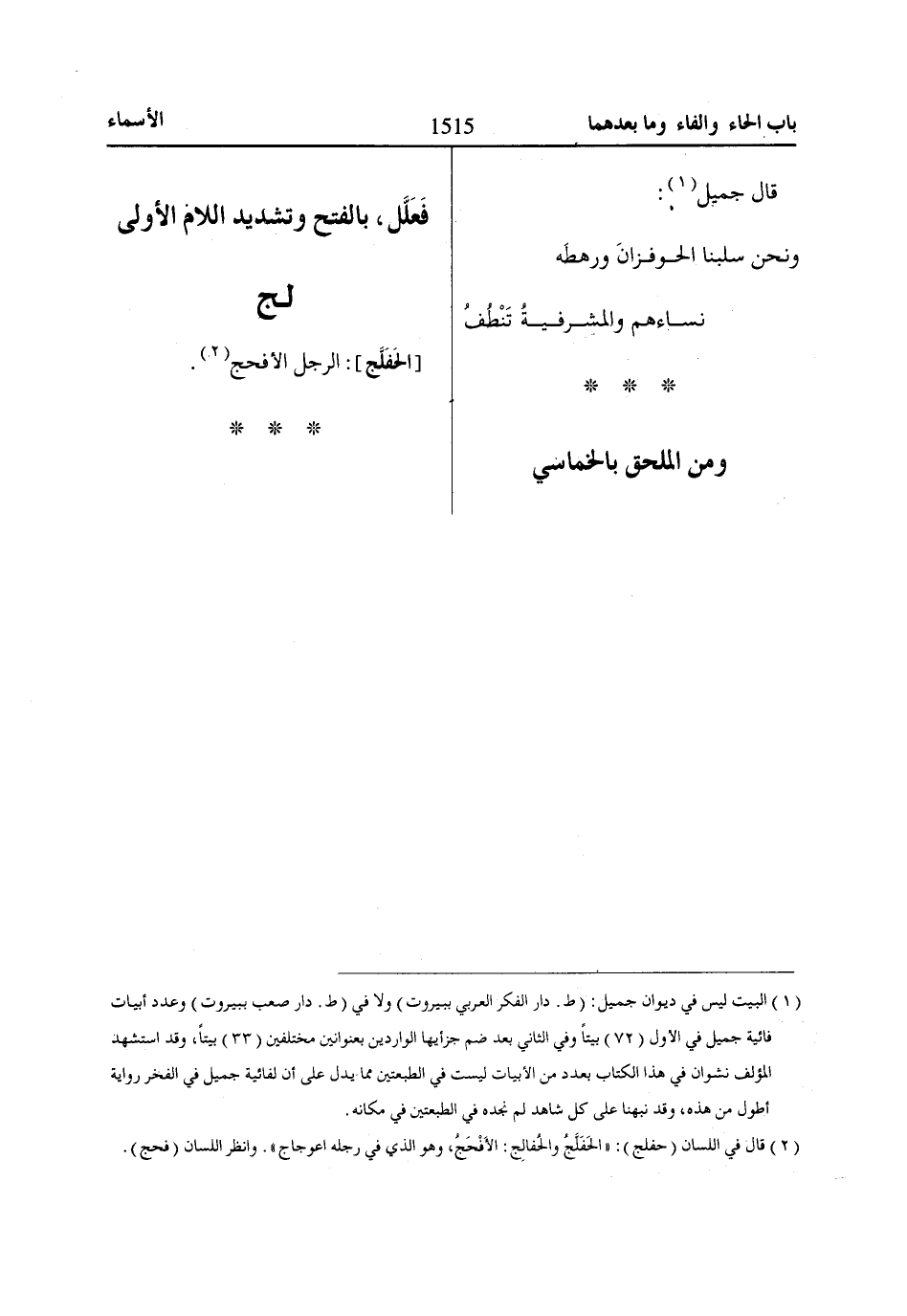 (2) قال في اللسان (حفلج): «الحَفَلَّجُ والحُفالِج: الأَفْحَجُ، وهو الذي في رجله اعوجاج». وانظر اللسان (فحج).