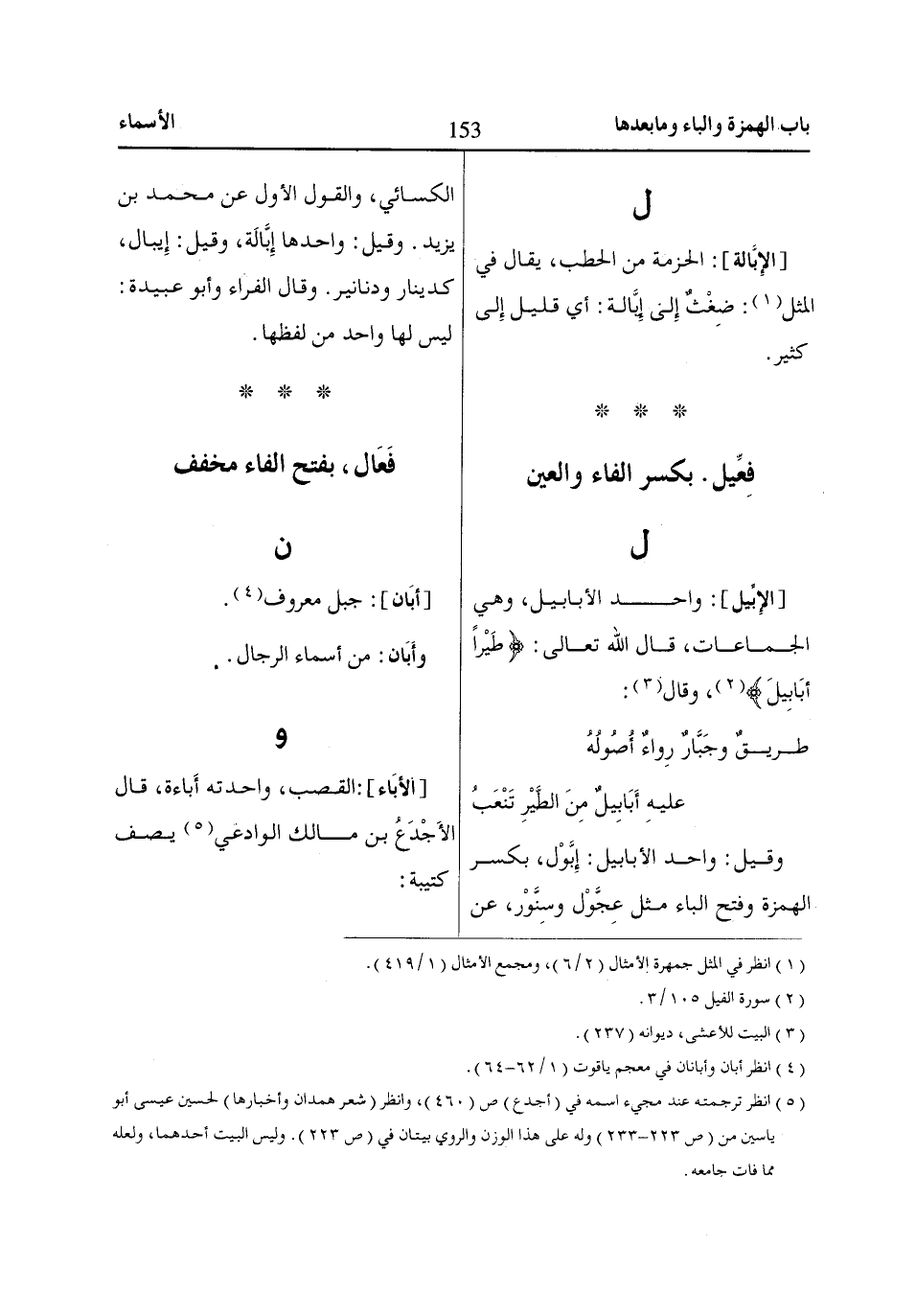 [الإِبِّيل]: واحد الأبابيل، وهي الجماعات، قال اللّاه تعالى: طَيْراً أَباابِيلَ «2»، وقال «3»: