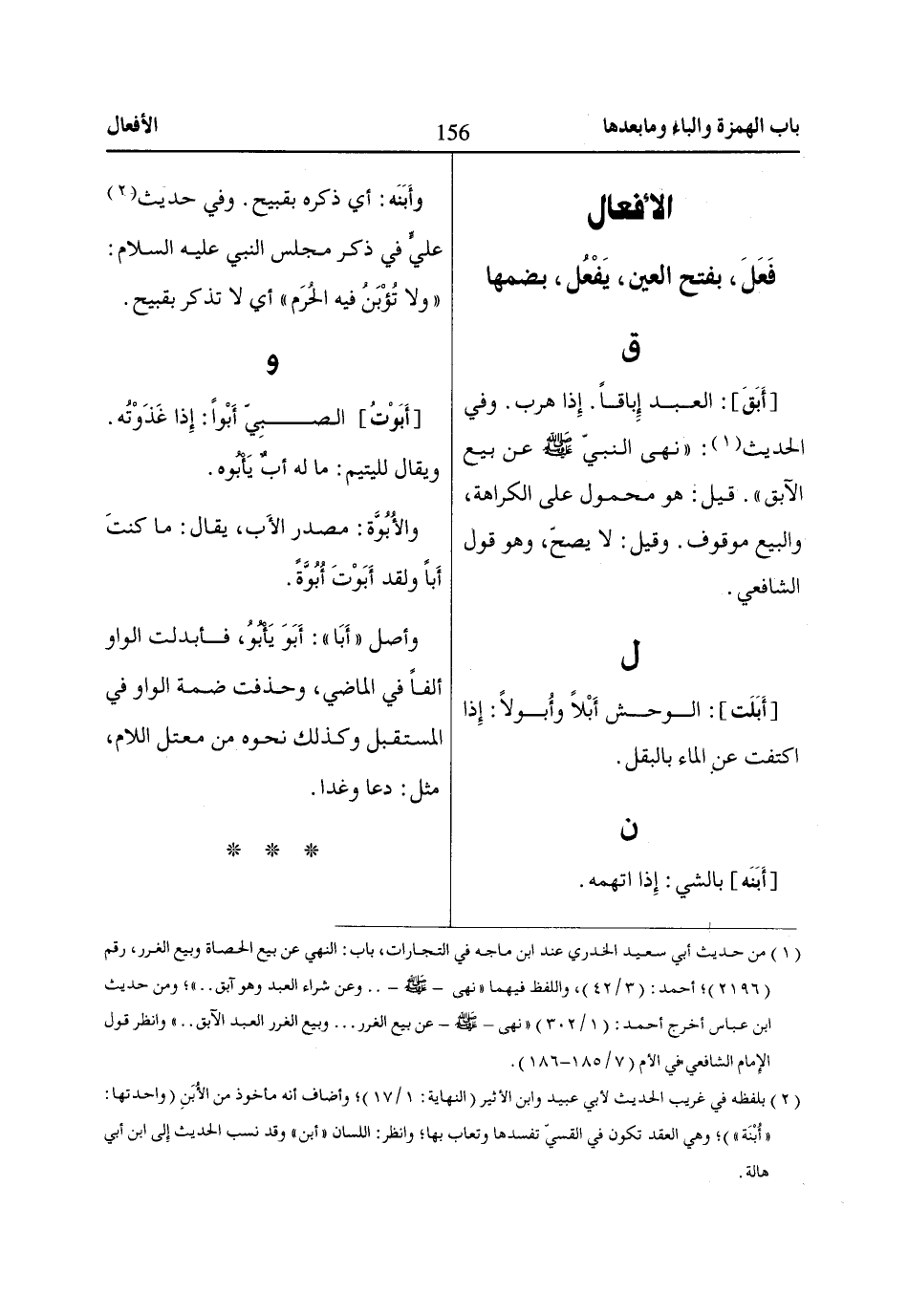 (2) بلفظه في غريب الحديث لأبي عبيد وابن الأثير (النهاية: 1/ 17)؛ وأضاف أنه مأخوذ من الأُبَنِ (واحدتها:
