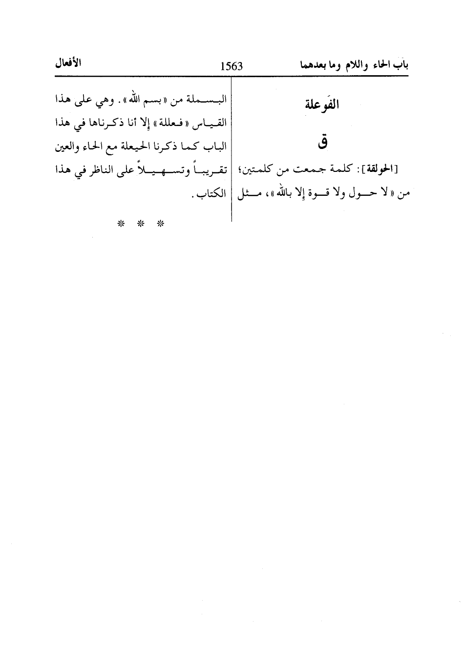 [الحولقة]: كلمة جمعت من كلمتين؛ من «لا حول ولا قوة إِلا بالله»، مثل البسملة من «بسم الله». وهي على هذا القياس «فعللة» إِلا أنا ذكرناها في هذا الباب كما ذكرنا الحيعلة مع الحاء والعين تقريباً وتسهيلًا على الناظر في هذا الكتاب.