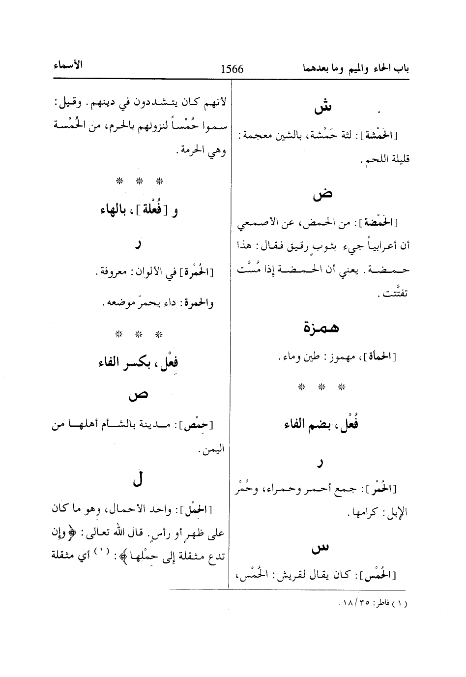 [الحُمْس]: كان يقال لقريش: الحُمْس، لأنهم كان يتشددون في دينهم. وقيل: