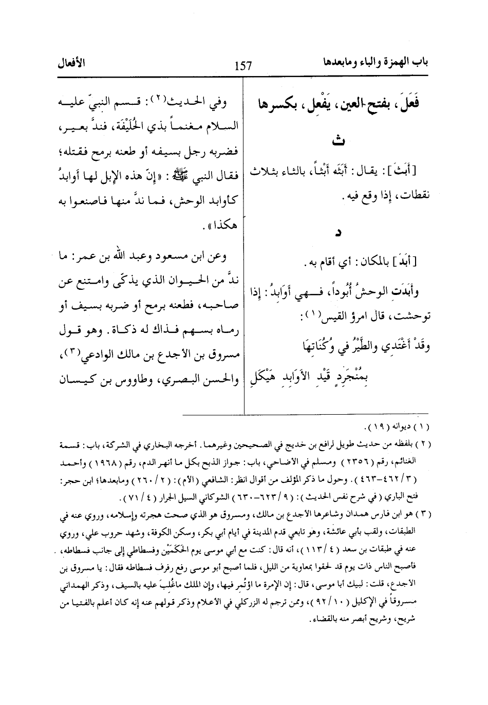 وفي الحديث «2»: قسم النبيّ عليه السلام مغنماً بذي الحُلَيْفَة، فندَّ بعير، فضربه رجل بسيفه أو طعنه برمح فقتله؛ فقال النبي صَلى الله عَليه وسلم: «إِنّ هذه الإِبل لها أَوابدُ كأوابد الوحش، فما ندَّ منها فاصنعوا به هكذا».