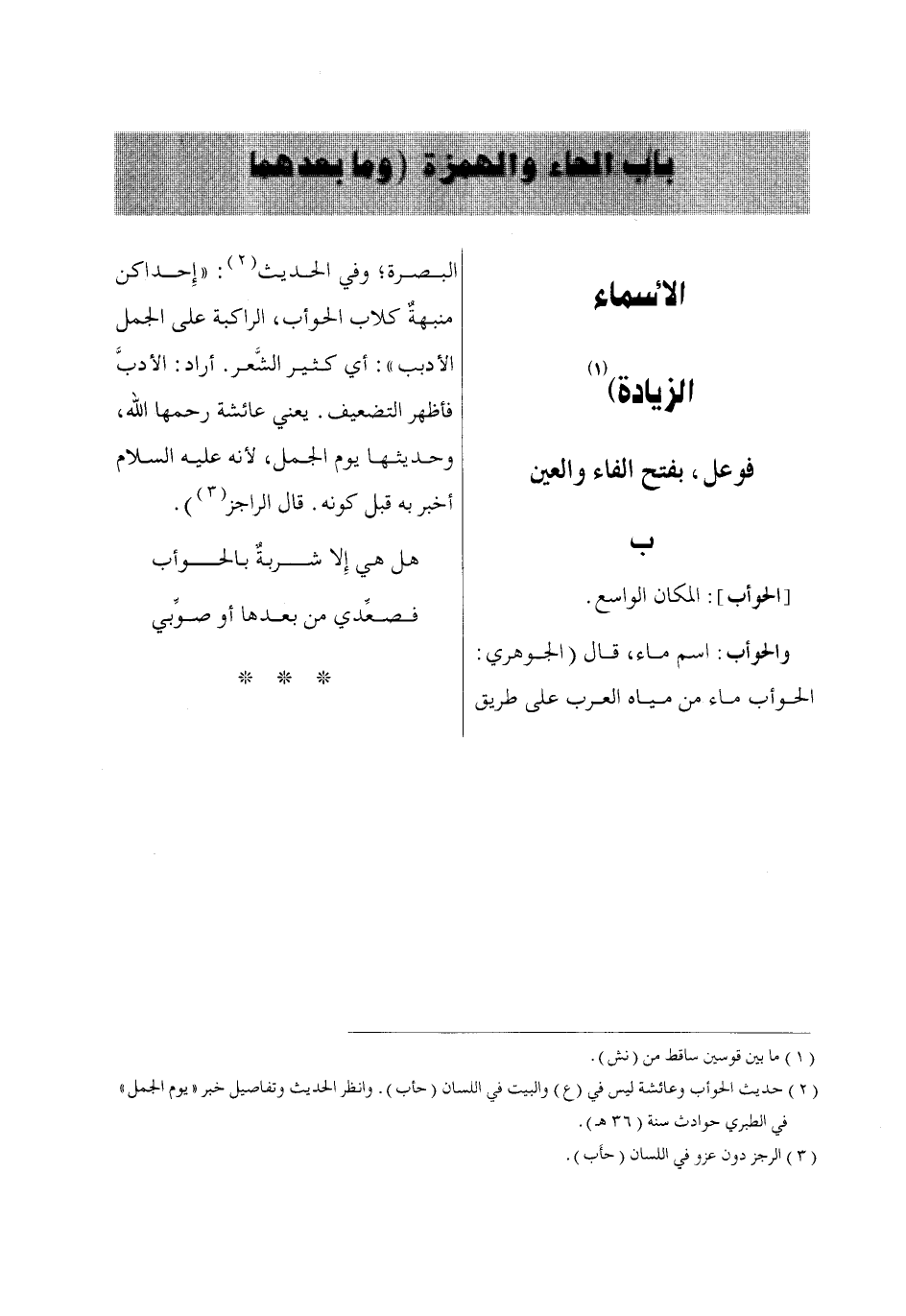 (2) حديث الحوأب وعائشة ليس في (ع) والبيت في اللسان (حأب). وانظر الحديث وتفاصيل خبر «يوم الجمل» في الطبري حوادث سنة (36 هـ).