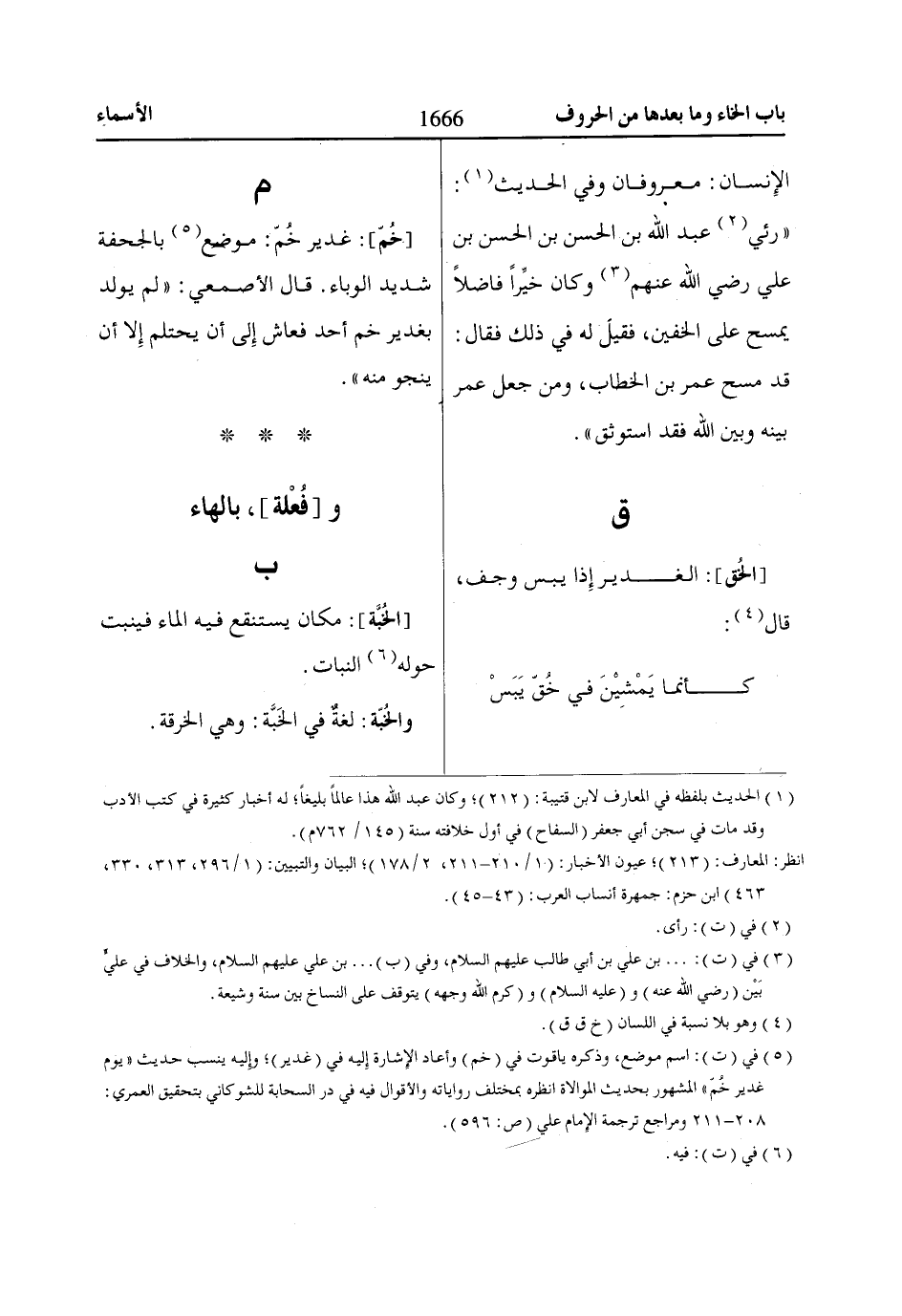 (5) في (ت): اسم موضع، وذكره ياقوت في (خم) وأعاد الإِشارة إِليه في (غدير)؛ وإِليه ينسب حديث «يوم غدير خُمّ» المشهور بحديث الموالاة انظره بمختلف رواياته والأقوال فيه في در السحابة للشوكاني بتحقيق العمري: