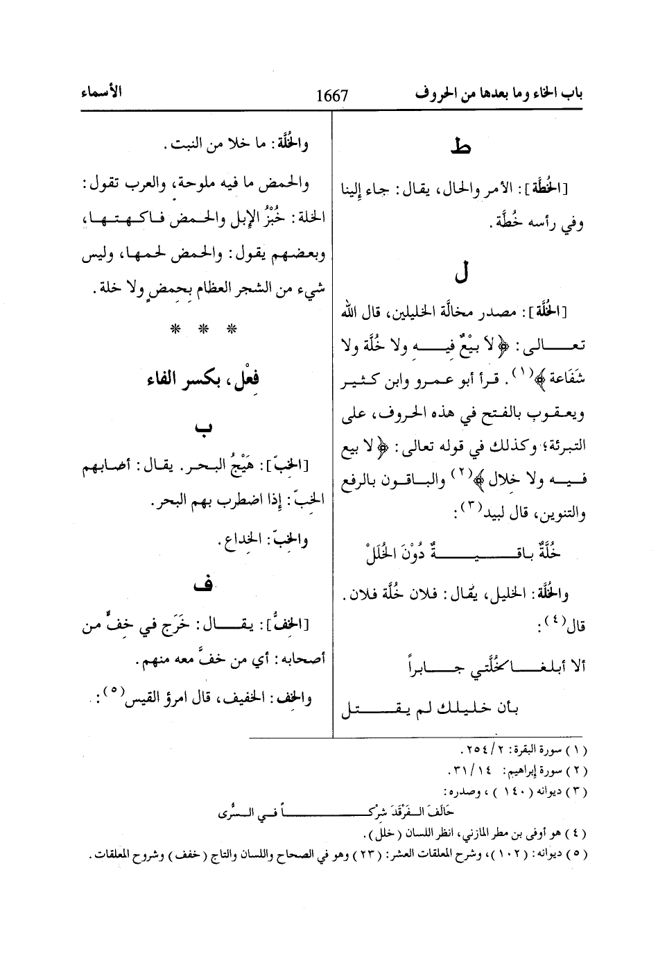 [الخُلَّة]: مصدر مخالَّة الخليلين، قال الله تعالى: لاا بَيْعٌ فِيهِ وَلاا خُلَّةٌ وَلاا شَفااعَةٌ «1». قرأ أبو عمرو وابن كثير ويعقوب بالفتح في هذه الحروف، على التبرئة؛ وكذلك في قوله تعالى: لاا بَيْعٌ فِيهِ وَلاا خِلاالٌ «2» والباقون بالرفع والتنوين، قال لبيد «3»: